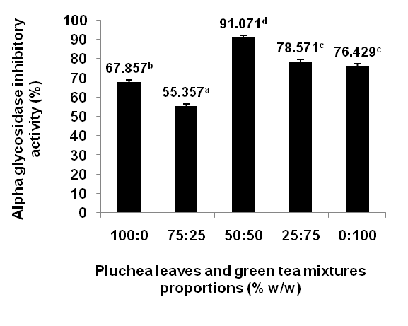Conclusion: The antioxidant capacity of pluchea leaves and green tea mixtures at various proportions had the graph pattern similar to the alpha glycosidase inhibitory activity and different with the alpha amylase inhibitory activity.