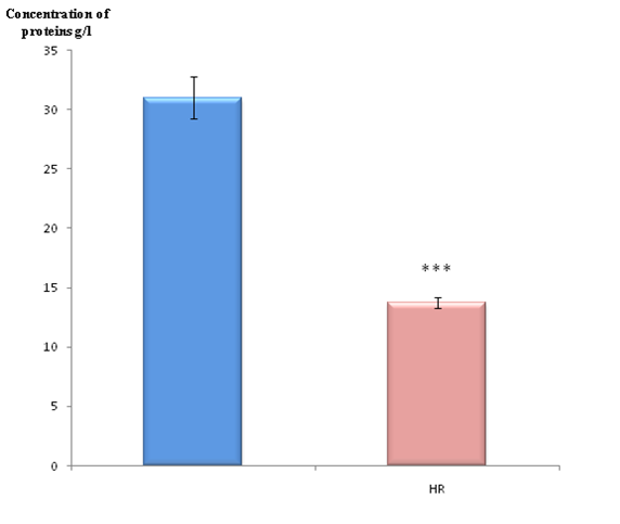 The protein dosage is realized on the skimmed cow's milk and on the infantile preparation with hydrolyzed rice protein (n=6) with n representing the number of samples. The results of the dosage are presented in the (Figure 1). The obtained results show that the content in proteins of the cow's milk is (30.98 ± 1.77) g/l. The content in total proteins of the preparation with hydrolyzed rice proteins is (13.71 ± 0.43) g/l.