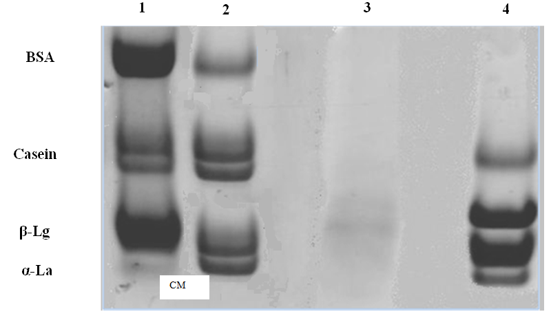 The realized gel is illustrated in the (Figure 2). The first well corresponds to a marker kit constituted by a mixture of pure bovine proteins, containing BSA (68000 Da), casein (24000 Da), ß-Lg (18000 Da) and α-La (14000 Da). The second well of the gel contains cow's milk, showing clearly the existence of various protein bands comparable to reference proteins. The analysis of the deposit of the rice formula in the third well shows the absence of intact proteins. The fourth well corresponds to a marker kit constituted by a mixture of peptides of low molecular weight of Sigma reference.