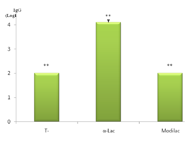 The reported values are averages and standard errors., T: Negative Control, α-Lac: reactivity of the protein α-La (pure fraction) with anti α-La IgG. Modilac: reactivity of hydrolyzed rice formula with anti α-La IgG., **p< 0.01