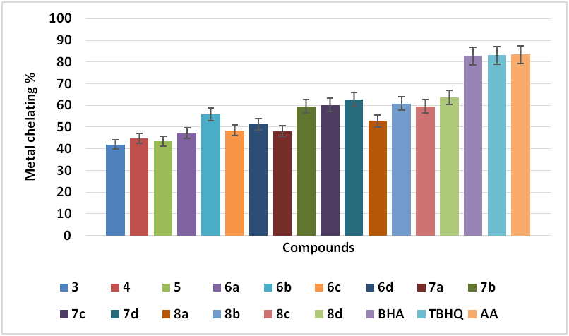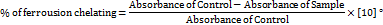 The chelating activity of ferrous ion of synthesized compounds was estimated by following reported method [28]. The test samples (25, 50, 75 and 100 µg/ml) in ethanolic solution (0.4 ml) were added to a solution of FeCl2 (0.05 ml, 2 mmol). The reaction was initiated by the addition of ferrozine (0.2 ml, 5 mmol) and the total volume was adjusted to 4 ml with ethanol. Ferozine reacted with the divalent iron, form stable magenta complex species that were very soluble in water. The mixture was shaken vigorously and kept at room temperature for 10 min. Then the absorbance of the solution was measured spectrophotometrically at λ 562 nm. All test analyses were run in triplicate and averaged. The percentage of inhibition of the ferrozine Fe2+ complex formation was calculated using the following formula: