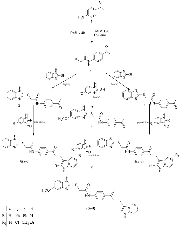 Compound 3, 4 and 5 on Claisen–Schmidt condensation with various 2,5-disubstituted indole-3-carboxaldehydes were refluxed in ethanol in the presence of piperidine to yield the products 2-((1H-benzo[d]imidazol-2-yl)thio)-N-(4-(3-(1H-indol-3-yl)acryloyl) phenyl)acetamide 6a-d, N-(4-(3-(1H-indol-3-yl)acryloyl) phenyl)-2-((5-methoxy-1H-benzo[d]imidazol-2-yl)thio)acetamide 7a-d and N-(4-(3-(1H-indol-3-yl)acryloyl)phenyl)-2-(benzo [d] thiazol-2-ylthio) acetamide 8a-d respectively as presented in scheme-1.