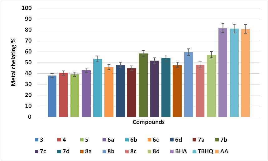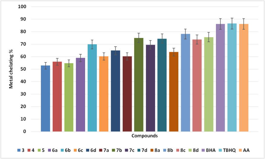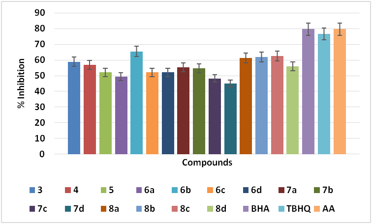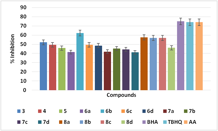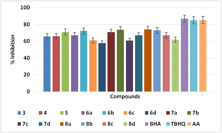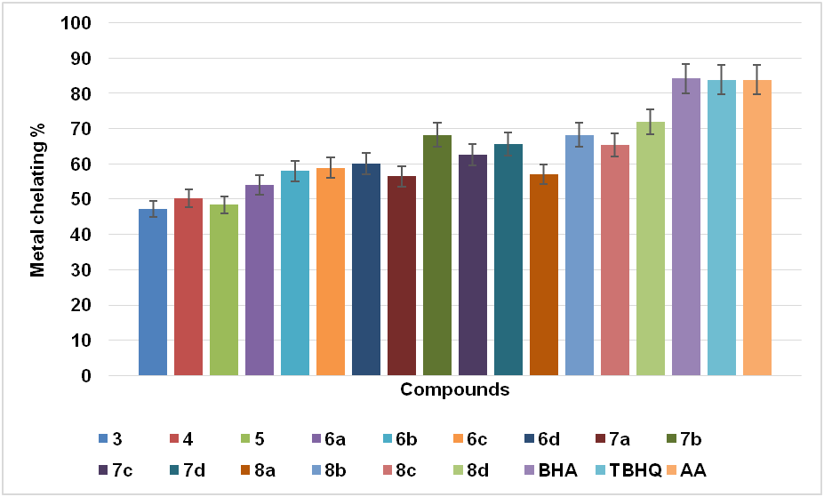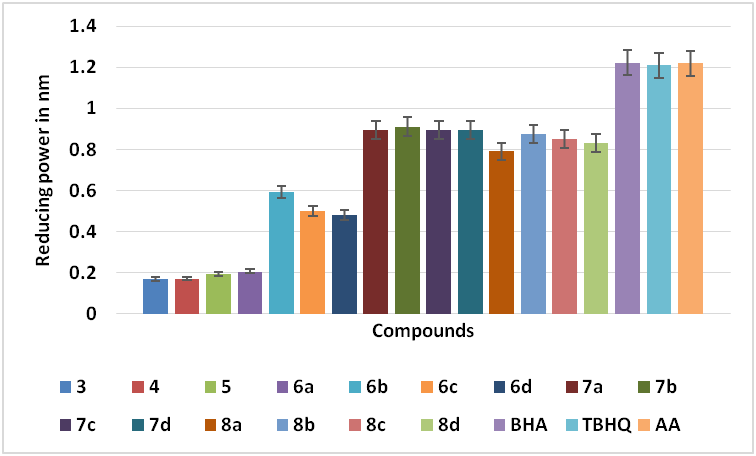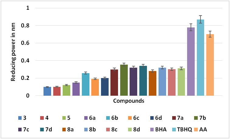 Results: The structures of all the newly synthesized compounds were characterized by their IR, 1HNMR, mass spectral studies and elemental analysis. Compounds 6b, 7a, 7b, 8a and 8b exhibited good radical scavenging activity (RSA) at a concentration 100 µg/ml, compounds 7b, 7c, 7d and 8b displayed good ferric ions (Fe3+) reducing antioxidant power (FRAP) at a concentration 100 µg/ml, compounds 7b, 7d, 8b and 8d showed good ferrous (Fe2+) ion metal chelating activity. Compounds 7d and 8d exhibited good activity against all the screened bacteria and fungi.