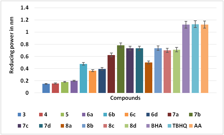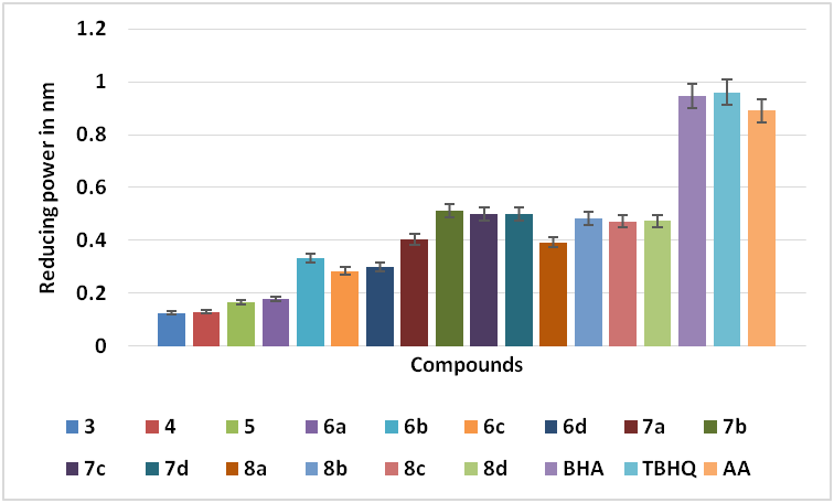Fig. 6: Reducing power activity of synthesized compounds at conc. 50 µg/ml, The graph represents the mean±SEM, (n=3), P<0.01-significant compared to the standard group