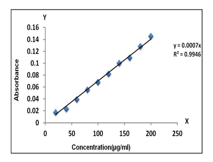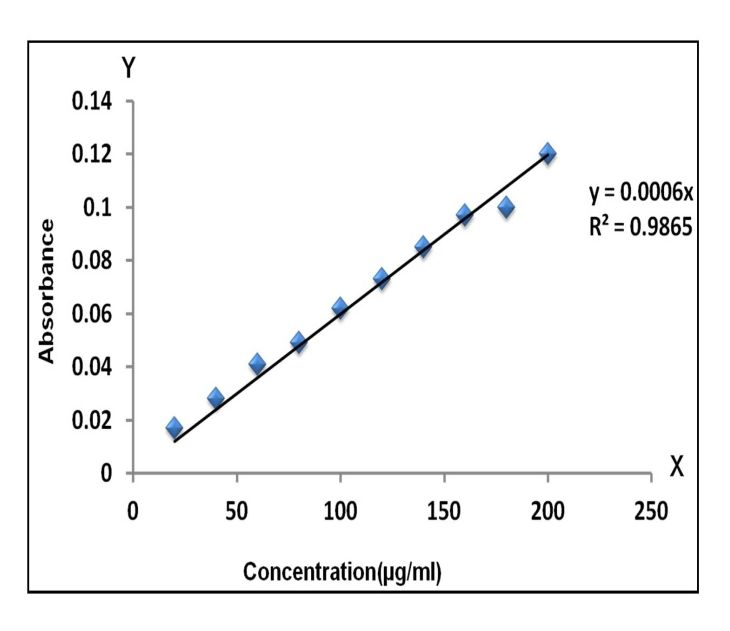 Total flavonoid content was determined by themethod proposed by Kim et al. [10]with minor modifications. 1ml of methanol extract of leaves was mixed with 4ml of double distilled water. Then, 0.3ml of 5% NaNO2 (w/v) was added and incubated for 5 min at room temperature. Later, 0.3ml of 10% AlCl3 (w/v), 2ml of 1M NaOH and 2.4ml of double distilled water was added. The mixture was incubated up to 30 min at room temperature and absorbance was measured at 510 nm using spectrophotometer (Shimadzu, UVmini-1240 UV-VIS Spectrophotometer). The experiment was performed in triplicate. The total flavonoid content was determined as mg quercetin g-1flavonoid using the standard curve.