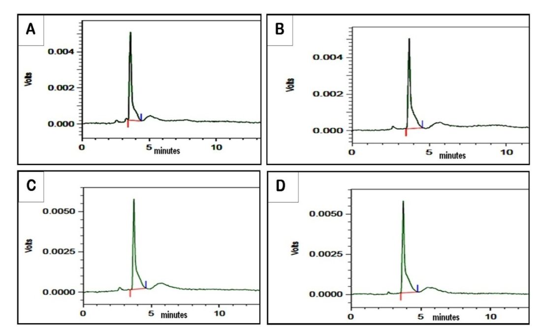 Fig.5: RP-HPLC chromatograms of methanol extracts of leaves of A.Hexaploid cytotype of Achyranthes asperaLinn., B. Dodecaploid cytotype of Achyranthes asperaLinn., C. Hexaploid cytotype of Achyranthes bidentataBlume, D. Dodecaploid cytotype of Achyranthes bidentataBlume. Chromatograms show gallic acid