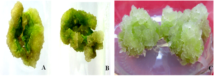 When Kin (1-6mg/L) alone was used as growth regulator, the callus was compact darkgreen and rhizogenic. At higher concentration of Kin (8-10mg/L) the callus was very compact and showed browning. When explants were innoculated on MS medium with combination 2, 4-D (2mg/L) and Kin ( 1-6mg /L ), maximum response of the callus formation was seen in all combinations as shown in table, but at higher concentration of Kinetin, callus underwent necrosis with browning. Similar observation was seen when combination of 2,4-D and NAA was used. But the morphology of the callus was slightly different when combination of Kin and NAA was used.The callus proliferation was robust without any rhizogenesis (Kin 1-6mg/L + NAA 2mg/L). Higher concentration of kinetin with NAA combination had negative effect with slow growth and finally leading to necrosis. When BAP either used alone (Fig. 1E) or in combination with Kin (Fig.1 D), the leaf explant formed shooty callus without any regeneration. To maintain the proliferation status the calli was subcultured on MS medium with 2mg/L Kin and 2mg/L NAA.