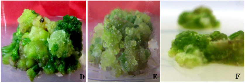Fig. 1: Different types of callus obtained using auxins and cytokinins A. 2,4-D (4mg/Lt) 3 weeks old callus, B. 2,4-D (1mg/Lt) 3 weeks old callus, C. NAA+KIN (2+2mg/Lt), D. KIN+BAP (1+2mg/Lt) 8 weeks old callus, E. BAP (2mg/Lt) 8 weeks old callus, F. KIN (5mg/Lt) 3 weeks old callus