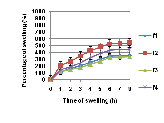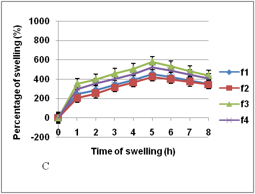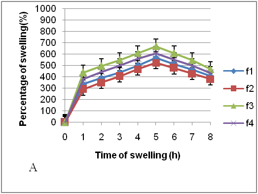 The higher percentage of swelling than those at pH 5.0 and 6.8 was achieved by the sample in pH 7.4 medium, increase in swelling percentage along with swelling time is observed, where the maximum value is recorded at the 5 h, shown in fig. 5. Fig. 5 shows the highest swelling percentage in the formula with higher pectin concentration, which is formula 3 and 4, and the lowest from formula 2. The degraded hydrogel swelling percentage (after 6 hours) in pH 6.8 and 7.4 medium is related to the erosion in the hydrogel matrix. Fig. 3 shows that swelling percentage on F3 was higher in pH 6.8 and 7.4 phosphate buffer compared to other formulas. Swelling percentage reached its maximum on the 5th hour of the test.