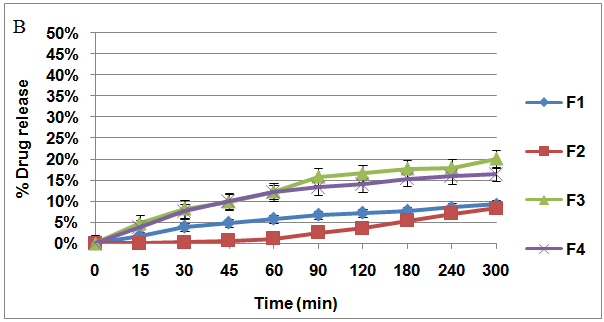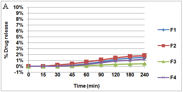 The test in pH 5.0 medium indicates the drug release was less than 2% in every formula during a4-hour testing, even within the first hour, only ≤ 1% drug release for every formula was attained. The highest release occurs in formula 2 with the release rate reaching 1.814% in a 4-hour test.