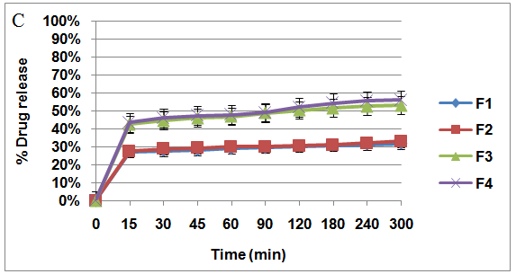 Fig. 4: Drug release on various pH. A: Drug release in acetic buffer (pH 5.0); B: Drug release in Phosphate buffer (pH 6.8); C: Drug Release in Medium Containing 2% of Rat Caecum.(na=3, mean value±SD)
