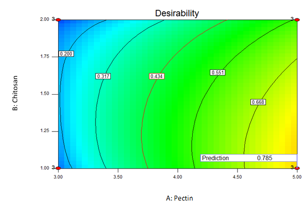The lower concentration of pectin will results in the lower desirability of the formula, in which a comparison of 4% pectin: 1.5% chitosan would only yield 55% of desirability.