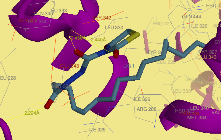 | 1 | O2 of LIG with GLY48 | 2.136 °A | N2H of LIG with Glu241 | 1.940 °A | O4 of LIG with SER342 | 2.403 °A |