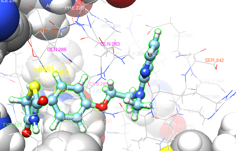 Fig. 7: A) Hypothetical interactive 1 ribbon representation of the N-oleoyl functionalised derivative in the active site of the PPAR--γ receptor (PDB ID: 2PRG) B) Interactive 2 (all atoms) representation of rosiglitazone used as standard for comparison represented in ball and stick model with the bond distances from S atom to the nearest residues in the predicted binding pocket