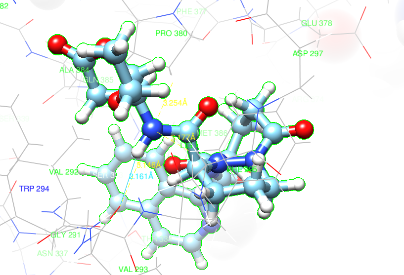 | 3 | O1 of LIG with ASP29 andO4 of LIG with GLY48 | 2.2130A and2.072 °A | N3H of LIG with TRP294 | 1.956 °A | O4 of LIG with SER342 | 2.398 °A |