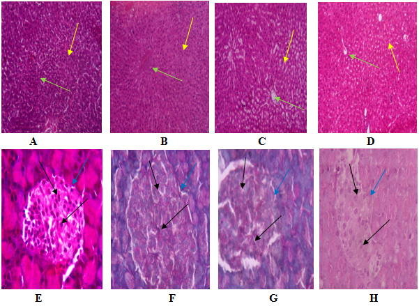 Fig. 1(A-H): Histopathological findings of liver and pancreas in diabetic rats, A: Rat Liver section of methanol extract of B. lacera (MEBL) 200 mg/kg treated diabetic rat, B: Rat Liver section of methanol extract of B. lacera (MEBL) 400 mg/kg treated diabetic rat, C: Rat Liver section of aqueous extract of B. lacera (AEBL) 200 mg/kg treated with diabetic rat, D: Rat Liver section of aqueous extract of B. lacera (AEBL) 400 mg/kg treated diabetic rat, E: Rat Pancreas section of methanol extract of B. lacera (MEBL) 200 mg/kg treated diabetic rat, F: Rat Pancreas section of methanol extract of B. lacera (MEBL) 400 mg/kg treated diabetic rat, G: Rat Pancreas section of aqueous extract of B. lacera (AEBL) 200 mg/kg treated diabetic rat, H: Rat Pancreas section of aqueous extract of B. lacera (AEBL) 400 mg/kg treated diabetic rat; All were stained with Eosin andGomori, Rat Liver sections are of 40X and Rat Pancreas sections are of 100X magnification power