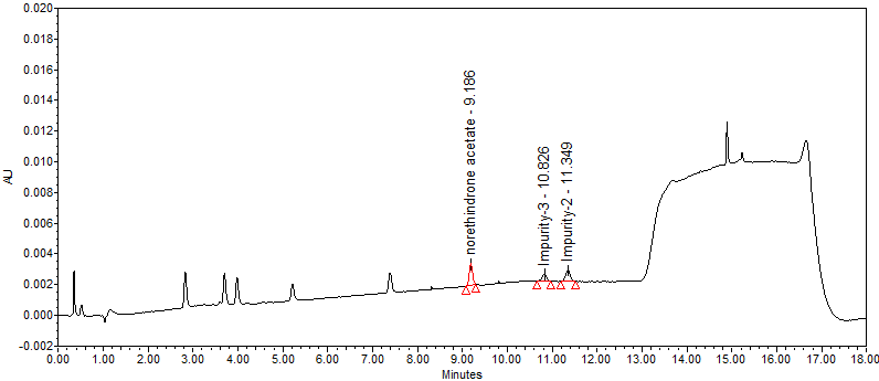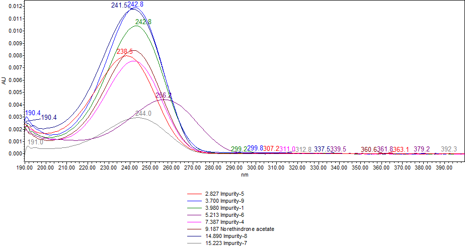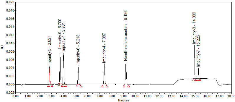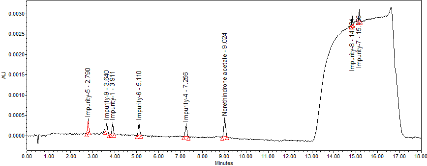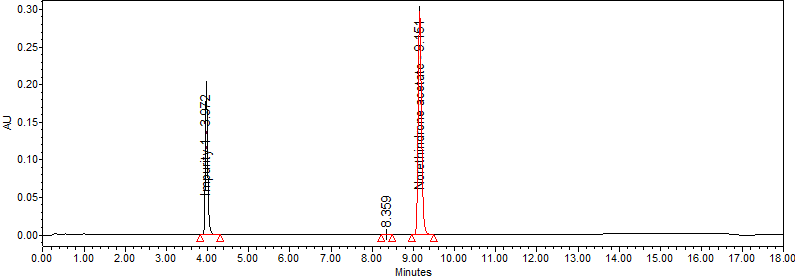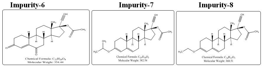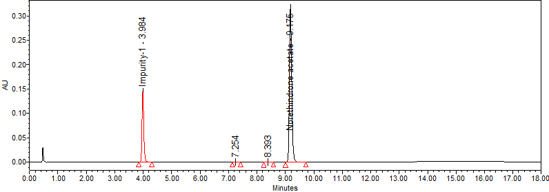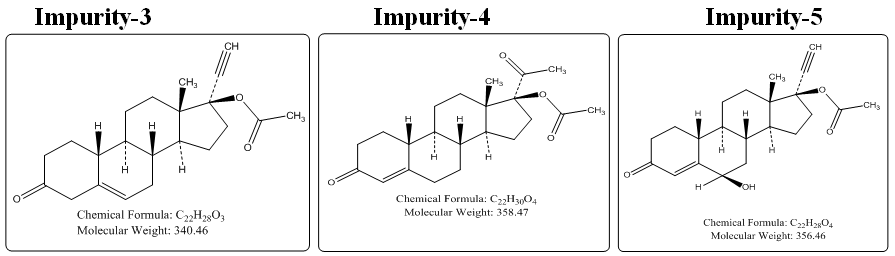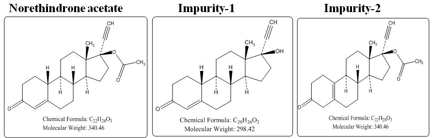 NA is a synthetic progestagenic compound and widely used for hormone replacement therapy and contraception is a female hormone. This medicine is used to treat endometriosis, uterine bleeding caused by abnormal hormone levels, and secondary amenorrhea. Secondary amenorrhea is when a woman stops getting menstrual periods due to low levels of certain female hormones. Chemically NA is (8R,9S,10R,13S,14S,17S)-17-ethynyl-13-methyl-3-oxo-,3,6,7,8,9,10,11,12,13,14,15,16,17-tetradeca-hydro-1H-cyclopenta[a]phenanthren-17-yl acetate. Chemical structures of NA and its organic impurities shown fig. 1. Impurity profiling of active pharmaceutical ingredients (API) and PFs is part of the most challenging tasks of pharmaceutical analytical chemists under industrial environment. Literature reveals that there are only few analytical methods for the estimation of NA in bulk and pharmaceutical dosage forms by HPLC [1-4] and Gas chromatography and mass spectrometry [5]. There have a coupled of reports of analysis of longer run time with HPLC assay methods and no organic impurities methods. An extensive literature indicates that till date there is not a single method has been reported for the determination of impurities either in bulk drugs or in PFs of NA with UHPLC-PDA and MS.