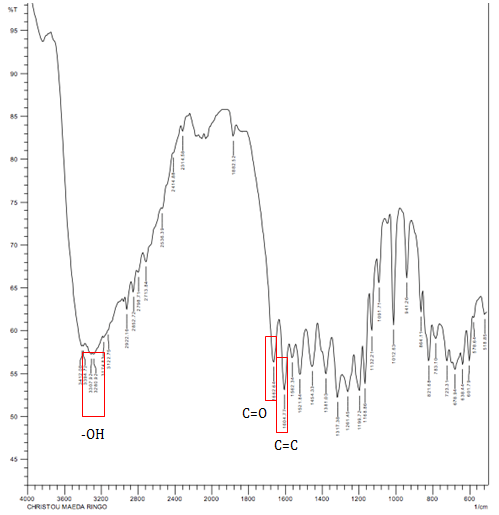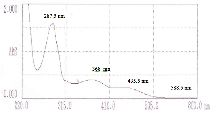 Its UV-Vis spectra (fig. 1) showed isolate in methanol has maximum absorption in wavelength 287.5 nm, 368 nm, 435.5 nm and 588.5 nm. Very strong absorption at 287.5 nm revealed that isolate has an aromatic group with ππ* transition [16]. Brazilein have one benzene ring that been fusion with dihydropirane ring. Peak at 368 nm indicates as an unsaturated keton that conjugated [16]. Brazilein also has its functional group. Isolate also has an absorption at 435.5 and 588.5 nm that means isolate has a long chromophore and auxochrome in its structure [16,17]. Auxochrome bind to chromophore system that makes the compound transition into bathochromic transition.