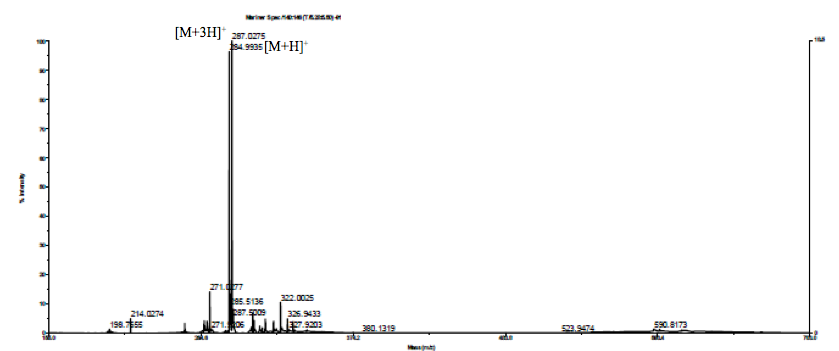 The result of mass spectra analysis of isolate was shown in fig. 3. The spectra were in positive ion mode. There was 2 peak with high intensity in m/z 287 and m/z 285. Peak in m/z 285 suitable with [M+H]+ion formula, by calculating the formula, we found the mass of isolate was 284. Brazilein with molecular structure C16H12O5 have molecular weight 284. This observation confirmed that isolate was brazilein, the major dyestuff component in kayu secang extract with molecular weight 284. This result was suitable with the other literature that brazilein is known to have a molecular weight of 284 [19-20].