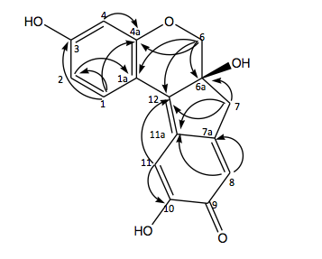 The 1H NMR spectra of isolate showed that isolate had seven different proton environment, five was an olefinic methane proton and two proton was a methylene signal, δ 3.68 (1H) and 3.92 (1H) were assigned to H-6. Signal at δ 2.76 (1H) and 3.01 (1H) as a H-7. The olefinic proton signal at δ 6.46 was ortho coupled with the signal at δ 7.18 (J = 8.0 Hz) and was meta coupled with δ 6.28 (J = 2.6 Hz). Therefore, these three olefinic signals were assigned to H-2, H-1 and H-4, respectively. H-8 and H-11 were assigned by 2D NMR such as HMQC, HMBC and 1H-1H COZY correlations.