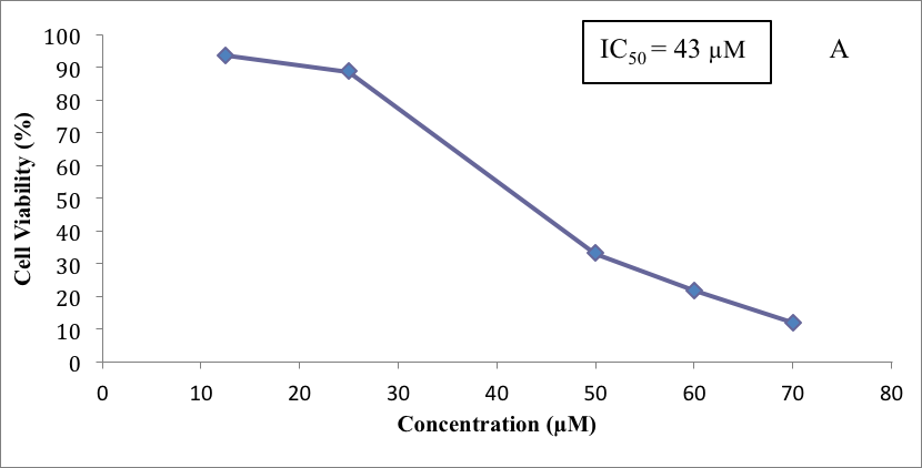 The cytotoxicity of brazilein on MCF-7/DOX cells was determined by using MTT assay. This assay is based on the reduction of the soluble yellow tetrazolium salt to a purple insoluble formazan product by mitochondrial succinic dehydrogenase which can be measured spectrophotometrically after dissolving in SDS solution [21]. The IC50 value was 43 µM (fig. 5). A potent cytotoxic activity was exhibited by brazilein against MCF-7/DOX cells.