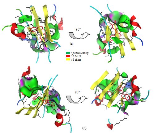 Fig. 6: Docking representations of brazilein and ATP interaction in ATP binding site to Pgp target proteins using PLANTS. The 3D interaction between brazilein and ATP binding site of Pgp (1MV5) (a); Interaction between ATP and ATP binding site of Pgp (1MV5)