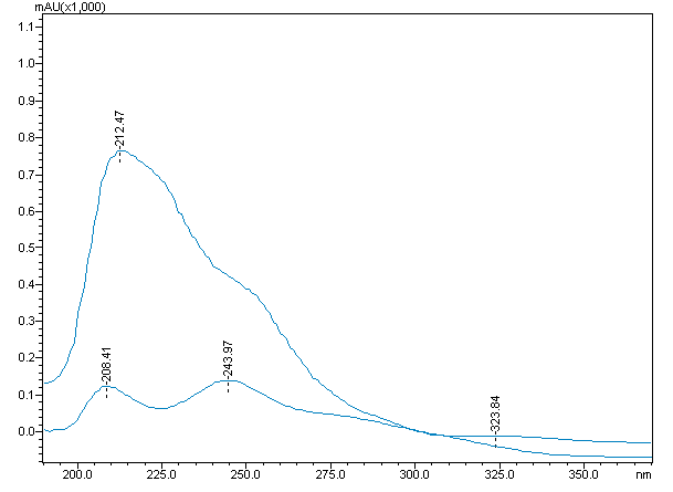 Standard solutions of phenytoin sodium and phenobarbitone were prepared at aconcentration of 10 μg/ml and scanned by UV/Visible spectrophotometer at the range of 200-400 nm.Combined UV spectrums of phenytoin sodium and phenobarbitoneare depicted in fig. 3. The isosbestic point selected for simultaneous estimation was 215 nm (fig. 3).