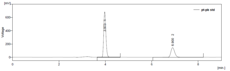 Different chromatographic conditions were tried for better separation and resolution. Hypersil BDS C18 (250 X 4.6 mm, 5 µm) column was found satisfactory. Peak purity of phenytoin sodium and phenobarbitone was checked using UV detector and 215 nm was considered satisfactory for detecting both the drugs with adequate sensitivity. A number of solvents in the different ratio over a wide range of pH were tried, but either peak shape was broad or resolution was not good. Repeated trials to obtain good, sharp peak with an efficient resolution between two peaks ofphenytoin sodium and phenobarbitone done on a C18 column in isocratic HPLC. The runtime was 9 min in isocratic trial with mobile phase consisting of methanol: phosphate buffer (pH5.0) (50:50) and C18-Hypersil BDS (250×4.6 mm, 5 μm) column, flow rate 1.0 ml/min and detection wavelength 215 nm gave the satisfactory results in terms of retention time, resolution, symmetry and sensitivity. A typical RP-HPLC chromatogram for simultaneous determination ofphenytoin sodium and phenobarbitone from standard preparation was obtained as shown in (fig. 4).
