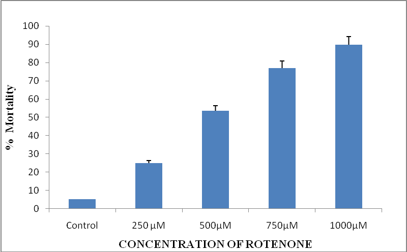 The flies were exposed to varying concentrations (250µM, 500 µM, 750 µM and 1000 µM) of rotenone (ROT) for 7 d in order to assess the lethality responses to choose the effective dose for LD 50 [12].