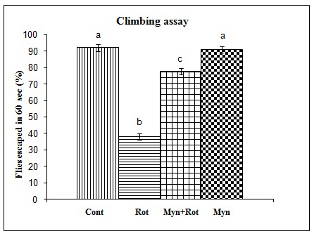 Fig. 2b shows the climbing assay of experimental groups in 25 cm long glass tubes. The group II rotenone treated flies consumed more time to climb the 25 cm glass tube and only about 38 % flies managed to reached the top compared to group I control and group IV myricetin alone treated groups in which about 92% and 91% of flies have reached top respectively. Group III flies (myricetin and rotenone treated) shown appreciable reduction in time consumption and about 77% of flies climbed to top compared to group II rotenone treated flies.