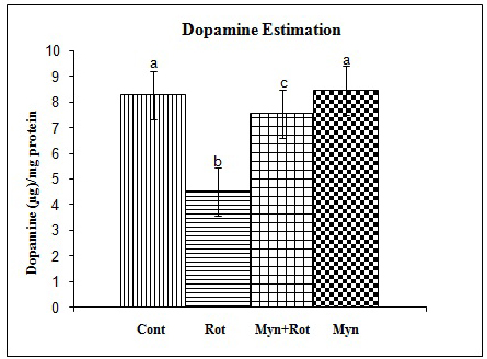 The important neuro-transmitter dopamine which is synthesized in dopaminergic neurons (DA) plays a vital role in muscular coordination. Degeneration of pigmented DA neurons in the Substantia nigra (SN) and loss of striatal dopamine is the hallmark of PD. In the present study group II rotenone treated shows 4.50µg of dopamine compared to the control group I (8.27µg of dopamine) which clearly indicates the degeneration of DA neurons by rotenone. Myricetin in group III significantly prevents the DA neurons and thereby shows increased dopamine concentration of 7.53 µg compared to the Group II flies. myricetin alone treated group IV shows nearly similar concentration of dopamine (8.45 µg) like group I control. The results of behavioral study and levels of dopamine are very much supported by earlier different study [27].
