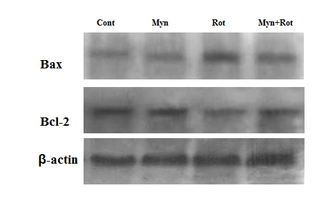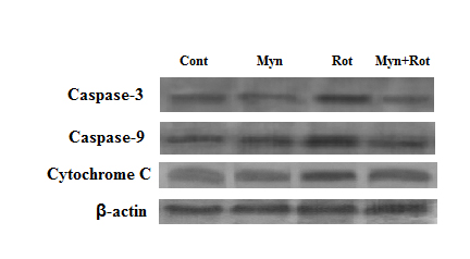 Rotenone treatment (500 µM) leads to decreased expression levels of anti-apoptotic B-cell CLL/lymphoma 2 (Bcl-2), but it increased the expression levels of pro-apoptotic Bcl-2-associated X protein (Bax). myricetin pretreatment (0.1%) retains the normal expression of Bcl-2 and Bax (fig. 5a). Treatment with rotenone (500 µM) increased expression levels of cyt c, caspases 3 and 9. myricetin pretreatment significantly suppressed the enhanced cyt c, caspases 3 and 9 expressions and prevents the apoptosis due to rotenone toxicity (fig. 5b).