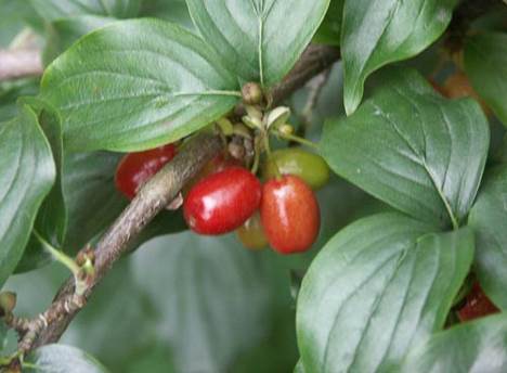 known as Cornelian cherry, European cornel or dogwood (Family Cornaceae) is a species of flowering plant native to southern Europe, Armenia, Azerbaijan, Georgia, Iran, Turkey, Lebanon and Syria. It is a medium to large deciduous shrub or small tree. The berries when ripe on the plant bear a resemblance to coffee berries and ripen in mid-to late summer. The fruit is edible but the unripe fruit is astringent. The fruit only fully ripens after it falls from the tree. When ripe the fruit is dark ruby red or a bright yellow. It has an acidic flavor which is best described as a mixture of cranberry and sour cherry, it is mainly used for making jam, makes an excellent sauce similar to cranberry sauce and then boiled with sugar and orange but also can be eaten dried. In Eastern Europe it is used as a medicine. It is very high in vitamin C and is used to fight colds. Cornus fruit has a long history of use in traditional Chinese medicine where it is used to tonify the kidneys and in cases of spermatorrhea [8]. The flowers are grown as an ornamental plant for its late winter flowers [Fig:2]