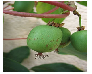 Commonly called as hardy kiwifruit (Family Actinidiaceae) is a perennial vine native to Japan, Korea, Northern China and Russian Siberia. It produces a small fruit resembling the kiwifruit. The fruit is referred to as kiwi berry, arctic kiwi, baby kiwi, dessert kiwi, grape kiwi, northern kiwi or cocktail kiwi and are edible berry or grape sized fruit similar to kiwifruit in taste and appearance but are green, brownish or purple with smooth skin sometimes with a red blush. It can be eaten whole and need not be peeled [33][34]. Thin walled,its exterior is smooth and leathery.They are very rich in vitamin C [Fig 12].