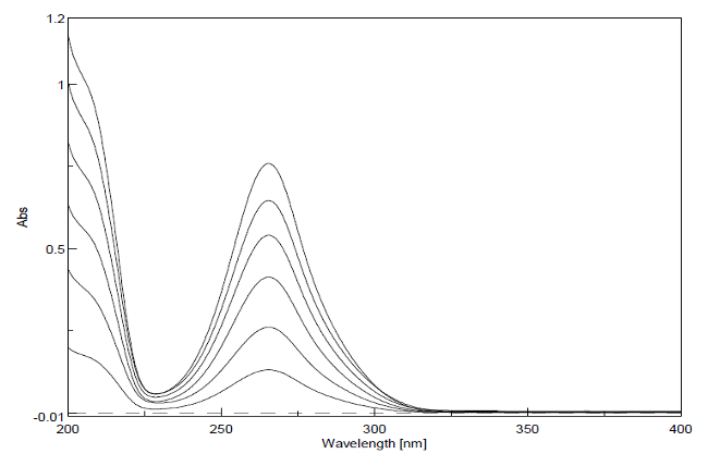 For the selection of analytical wavelength, standard solution of DRV was scanned in the spectrum mode from 400 nm to 200 nm. From the spectra of drug [Fig.2], λmax of DRV, 266 nm was selected for the analysis. Aliquots of standard stock solution were made and calibration curve was prepared in the concentration range of 3-18μg/ml [Fig.3], at 266nm.