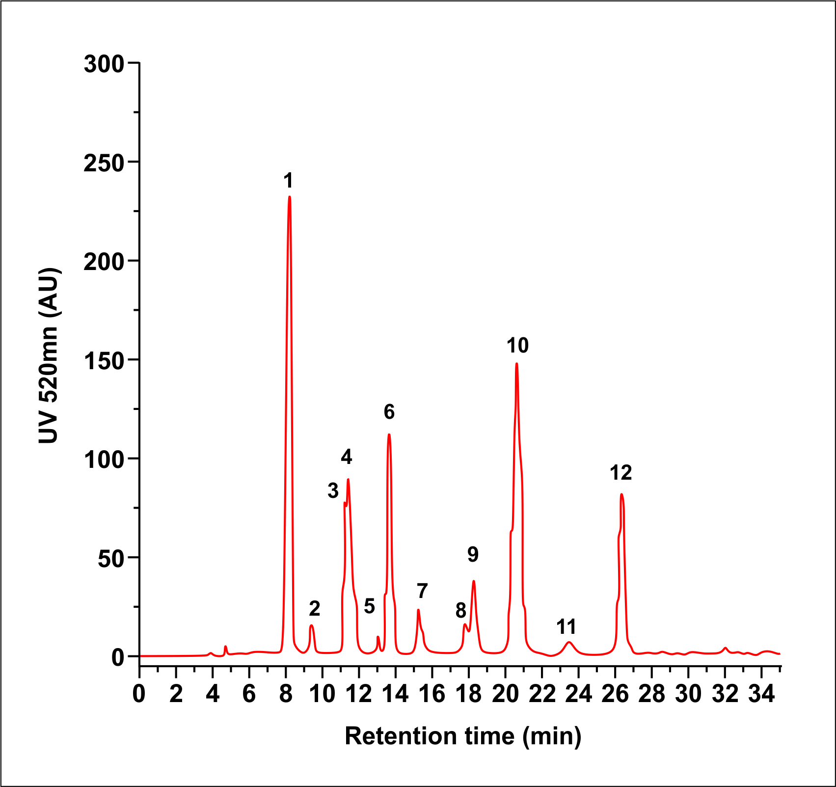 Crude anthocyanin extract was subjected to purification using three different columns and was further subjected to fractionation using HPLC-PDA.