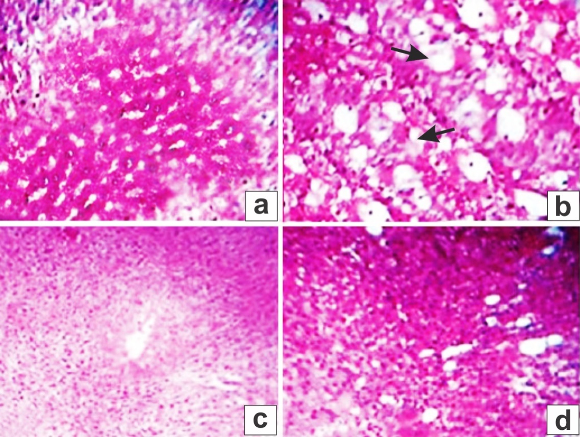 Appropriate sized liver samples from each experimental group were dissected and fixed in 10 % neutral formalin, dehydrated in ascending grades of alcohol and imgded in paraffin wax. 5 μm thick paraffin sections were stained using haematoxylin and eosin (H and E). Two slides were prepared for each mice; each slide content two sections. Ten field areas for each section were selected and analyzed for histopathological features (x160) under a light microscope. The liver fields were scored as follows: normal appearance (−), minimal cellular disruption in less than 1 % of field area (+), mild cellular disruption of 1-30 % of field area (++), moderate cellular disruption of 31-60 % of field area (+++), severe cell disruption of 61-90 % of field area (++++) and very severe cellular disruption of 91-100 % of field area (++++) [29].