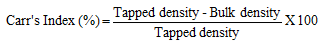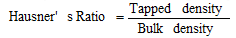 Then the final volume (tapped volume) was noted down. Bulk density and tapped density were calculated from the following formula.