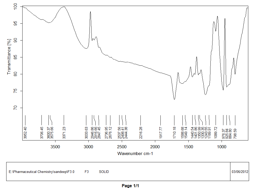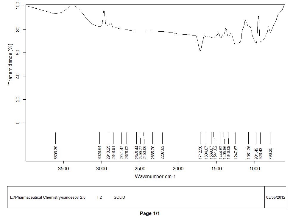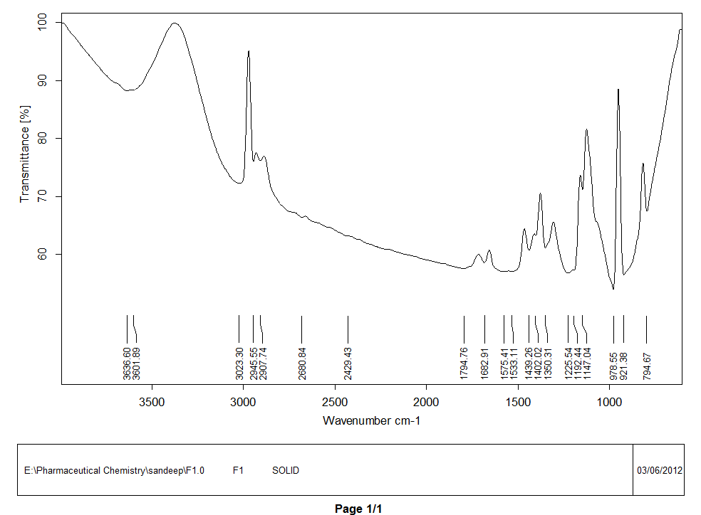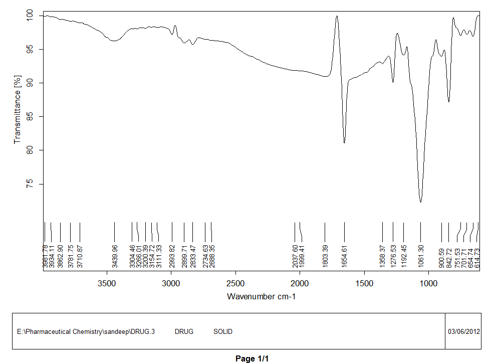 The pure drug and optimized formulations were subjected for FTIR analysis. The samples were scanned over a range of 4000-400 cm-1 using Fourier transformer infrared spectrophotometer. Spectra’s were analyzed for drug polymer interactions.