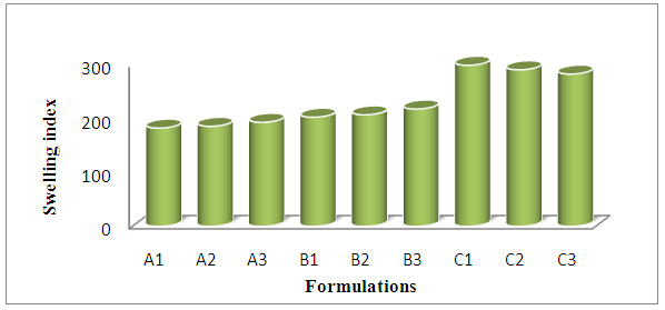 Fig. 5: Swelling study profiles of all three Batches A, B and C formulations.