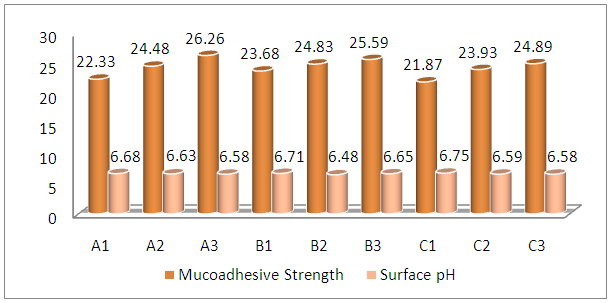 Fig. 6: Mucoadhesive strength and Surface pH profile of all three batches A, B and C formulations