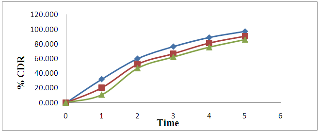 In vitro release studies were carried out using USP dissolution testing apparatus II (paddle type). The dissolution medium consisted of 500 ml of saline phosphate buffer (pH 6.4). The release was performed at 37ºC ±.5ºC, with a rotation speed of 50 rpm. Samples (5ml) were withdrawn at predetermined time intervals (1, 2, 3 up to 8 hrs) and volume was replaced with the fresh medium. The samples were filtered through Whatman filter paper and analyzed after appropriate dilution by UV spectrophotometer at 210nm. The experiments for different Batches A, B and C formulations were conducted in triplicate and average values were recorded. The release kinetics such as zero order, first order, Higuchi and Hixson- Crowell were determined.