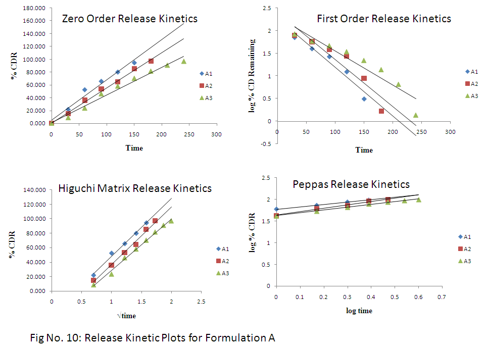 To analyze the mechanism of release and release rate kinetics of the dosage form, the data obtained were fitted into Zero order, First order, Higuchi matrix, Peppas and Hixson-Crowell model using PCP-DISSO-v3 software. Based on the r-value, the best-fit model was selected. To study the release kinetics, data obtained from in vitro drug release studies were plotted as log cumulative percentage drug release versus log time.