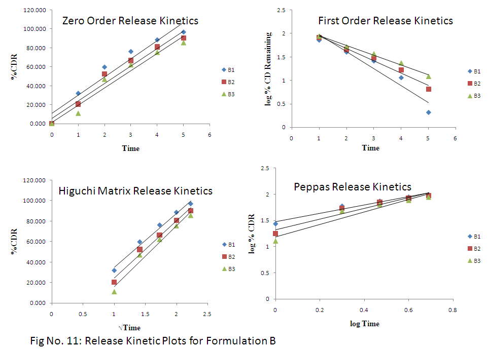 But the formulation B1 showed the ‘n’ value 0.69 indicating that the drug release occurred via non-fickian diffusion. The kinetic plots obtained of respective batches are shown in Fig 10, 11 and 12.