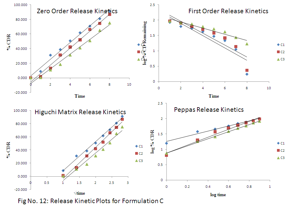 The results of dissolution data were fitted to various kinetic equations to analyze the release mechanism. All the formulations of batch C & A except A1 followed zero order kinetics and all other formulations of batch B and A1 formulation followed Hixson-Crowell model.
