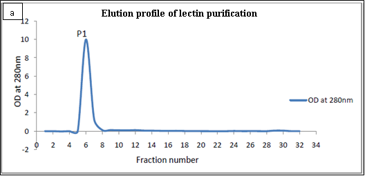 The salt precipitated fraction was dialyzed in the Gly-NaOH buffer of pH 8.6 and was applied to the Carboxy Methyl (CM) cellulose column. Lectin eluted as a single peak with 0.1M sodium chloride prepared in the same buffer (fig. 2a). The dialyzed column fraction corresponding to Peak 1 gave a hemagglutination titer of 256, thus confirming the presence of agglutinins in the eluted fraction. The concentration of the fraction with Amicon Ultra-4 10K Centrifugal Filter Devices (molecular weight cut off-10 kDa) gave a titer value of 8192 (fig. 2b).