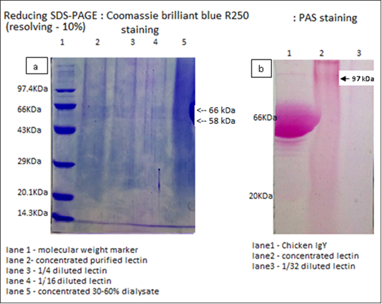 Fig. 3: Polyacrylamide gel electrophoresis of purified lectin under reducing conditions. (a) Gel stained with Coomassie brilliant blue-R250 showing 2 prominent bands of molecular weight 66 kDa and 58 kDa. (b) PAS staining of a replica of the gel showing a band of molecular weight ∼97 kDa just below the resolving gel and a smear following that