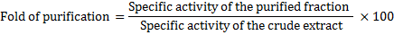 | 30-60% ammonium sulphate precipitate | 0.13±0.005 | 3413±1182 | 25997.3±8338 | 18.25±0.71 | 5.4±0.5 | 477866±165538 | 9.8±0.4 | 1.8±0.12 |
