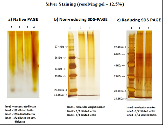 Fig. 4: Silver staining of purified lectin under various electrophoresis conditions. (a) Native PAGE shows mostly smeared appearance of the protein with a faint band at the top of the gel just below the resolving gel. (b) Non-reducing SDS-PAGE with a diffuse band at the top of the gel with a molecular weight greater than 97 kDa. (c) Reducing SDS-PAGE showed 4 discrete bands of molecular weight in the range 43-66 kDa as marked in the fig.