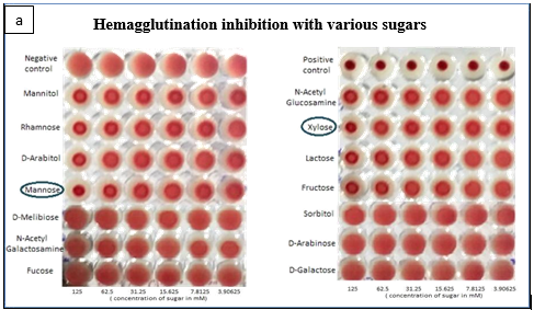 Out of the various sugars tested, mannitol, rhamnose, D-arabitol, mannose, D-melibiose, N-acetyl Galactosamine, fucose, N-acetyl Glucosamine, Xylose, lactose, fructose, sorbitol, D-arabinose, and D-galactose, only Mannose and Xylose showed complete inhibition of agglutination at a concentration of 125 mmol (fig. 5a).